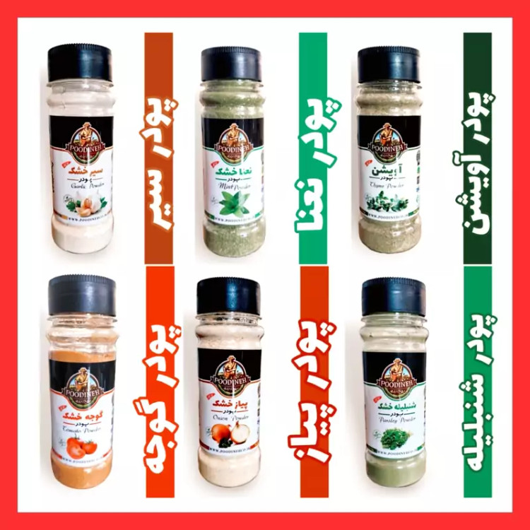 پک پودری محصولات پودینه شامل پودر آویشن،پودر سیر،پودر پیاز،پودر گوجه،پودر شنبلیله و پودر نعنا می باشد.